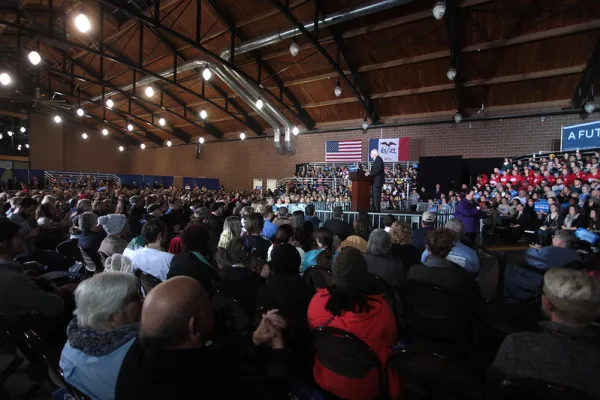 U.S. Senator Bernie Sanders speaking with supporters at a campaign rally at the Paul R. Knapp Learning Center in Des Moines, Iowa.