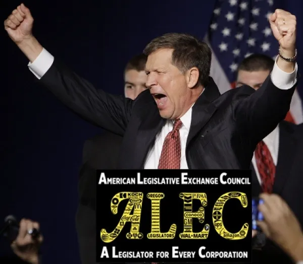 Who Kasich really listens to is the American Legislative Exchange Council (ALEC). More than three decades ago, this corporate front masquerading as an advocate for “limited government” and “free markets” began plotting to make the 1 percent richer and steal the wealth of our nation’s working class. ALEC lists among its key founders Paul Weyrich, who openly advocates suppressing poor and minority voters, as well as the white supremacist, the late Senator Jesse Helms. Also on the ALEC website there’s a note stating “Among those who are involved with ALEC in the formative years were … John Kasich of Ohio.” ALEC, now primarily funded by the notorious Koch Brothers, provided Senate Bill 5 as its model legislation and its legislation is a manual for destroying worker’s rights under the guise of “saving taxpayers money.”