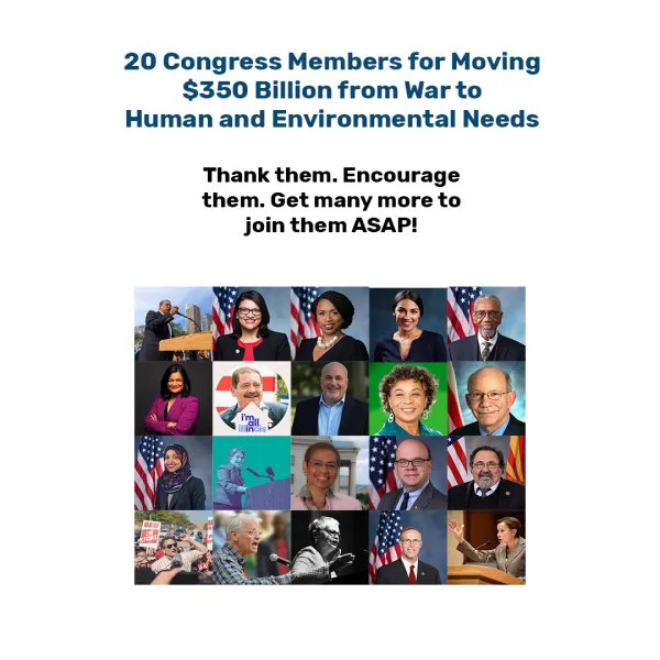 The U.S. Congress has 100 Senators and 435 House Members. Out of the full 535, there are 20 thus far who have made themselves sponsor or cosponsor of a resolution to do what is most badly needed, move major amounts of money out of wars and war preparations and into human and environmental needs.