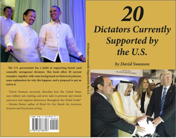As documented here, the U.S. government arms, trains, and funds all variety of oppressive governments, not just dictatorships. The choice to focus on dictatorships in this book was not made merely to shorten the list. Rather, that choice was made because the U.S. government so often claims to be opposing dictators through the promotion of democracy. Frequently, the atrocious conduct of a dictator is a central selling point for a new war or coup or program of sanctions.