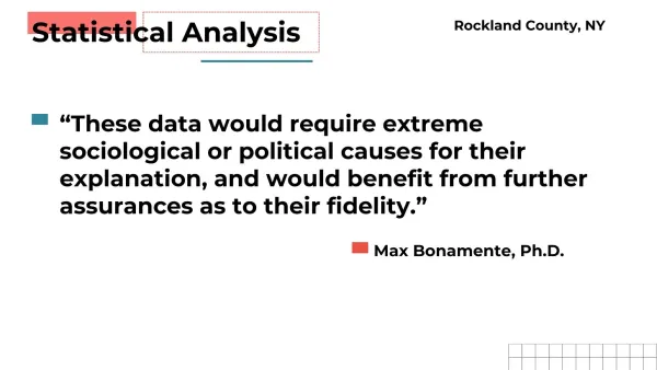 Max Bonamente, Ph.D., Professor of physics and astronomy at the University of Alabama in Huntsville and the author of the textbook, “Statistics and Analysis of Scientific Data,” says in an upcoming paper on the Rockland data, “These data would require extreme sociological or political causes for their explanation, and would benefit from further assurances as to their fidelity.”