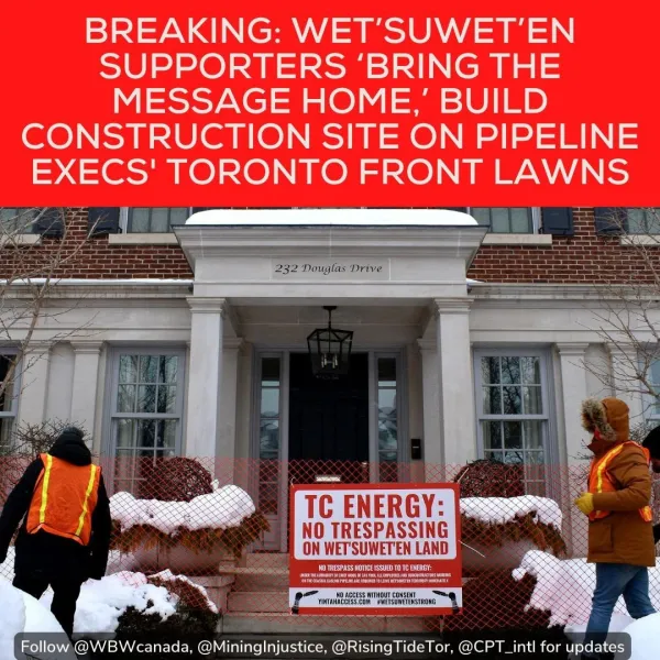 Toronto, Ontario, Canada — This morning, Toronto supporters of the Wet’suwet’en land defense struggle against the Coastal Gaslink pipeline set up construction sites at the Toronto homes of TC Energy Board Chair Siim Vanaselja and Royal Bank of Canada Executive Doug Guzman. The supporters also flyered the neighborhood with photos of the two men with signs warning, “Your neighbour is pushing the Coastal Gaslink pipeline through Wet’suwet’en Territory at gunpoint.”
