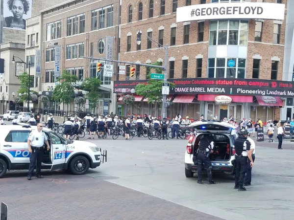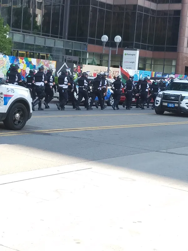 5 pm: Over 81 police cars with CPD officers in riot gear lined up as far as the eye can see down High Street, in response to BLM protesters at the Ohio Statehouse. Major overtime. Your tax dollars at work.