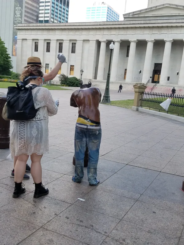 5 pm: State police guarding the Ohio Statehouse during protests Sunday evening. Note red paint on stone facade, remnants of "bloody" handprints applied by protesters on Friday.