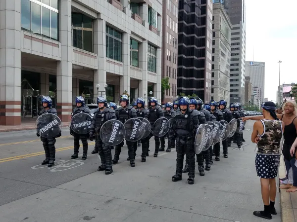 After a day including an LGBTQ-Black Lives Matter march at noon and other anti-police brutality gatherings at the Statehouse this evening, the Columbus Police and SWAT seemed to anticipate trouble with an unprecedented and unnecessry show of force around 5pm, witnesses report. Bike cops rammed into protestors without provocation. On Facebook videos, police are seen running on the sidewalk and one wrestling with and punching a young black man. It is unclear what prompted this proactive violence on behalf of the police.