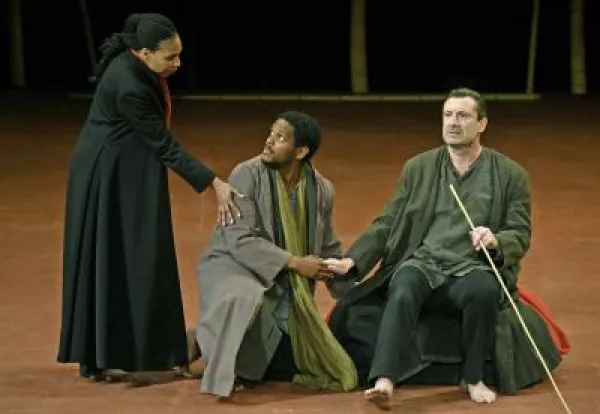So I went to see Battlefield - co-helmed and adapted by 92-year-old Brook and Marie-Helene Estienne, written by the playbill-slighted Carrière - with great expectations worthy of a Pip, anticipating a pip of a production. Battlefield is derived from an ancient Indian Sanskrit poem called The Mahabharata, which Brook and Carrière co-rendered as a nine hour long play that premiered in 1985 and has been critically acclaimed. Mercifully, Battlefield is only 70 minutes long and performed sans intermission (and sans Sanskrit, as the four actors’ dialogue is all in English) - the only thing epic about this production is its Brechtian style, which BTW does an excellent job of alienating viewers from the story, which is mostly told and little shown on a bare stage with its boards trod upon by barefoot thesps. There are just a few bamboo trimmings that would have gladdened the heart of Jerzy Grotowski, that fan of a poor theater. (Whoever designed this minimalist set has the world’s second easiest job, behind only cashiers with seats at 99 cent stores.)