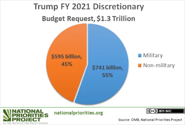 Trump’s 2021 budget request varies little from past years. It includes 55% of discretionary spending for militarism. That leaves 45% of the money Congress votes on for everything else: environmental protections, energy, education, transportation, diplomacy, housing, agriculture, science, disease pandemics, parks, foreign (non-weapons) aid, etc., etc.