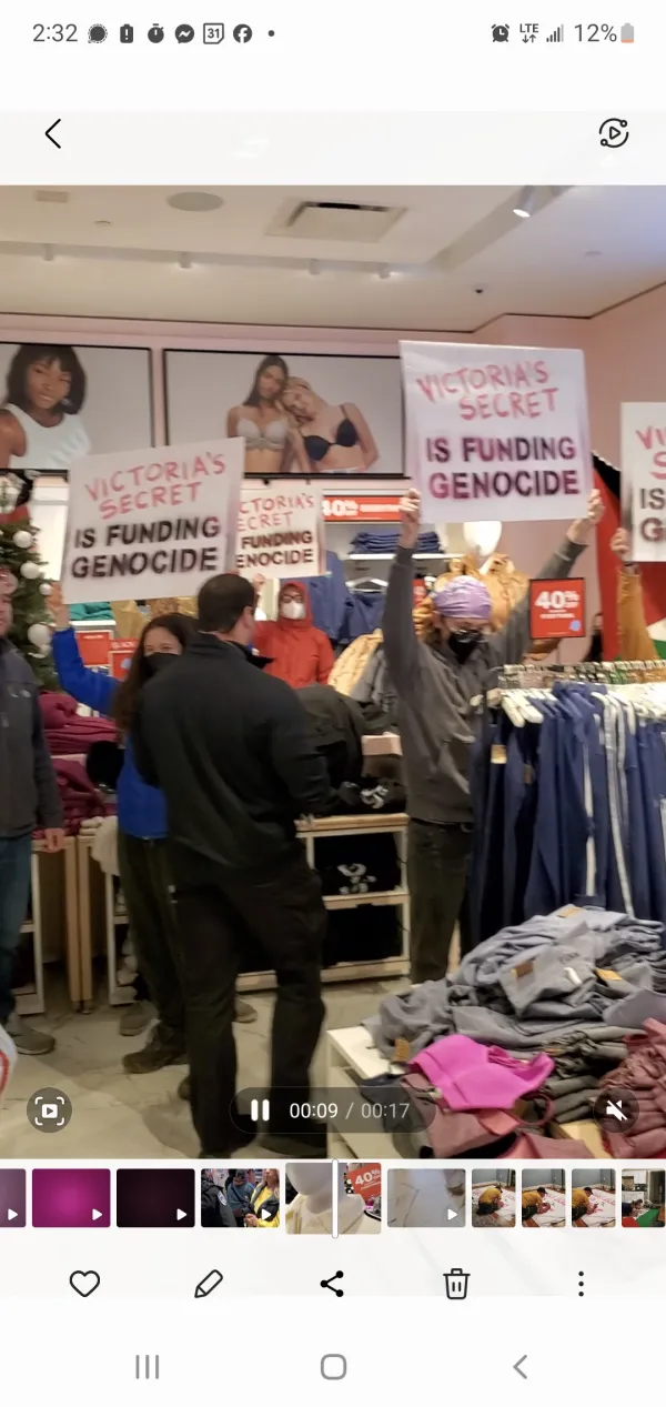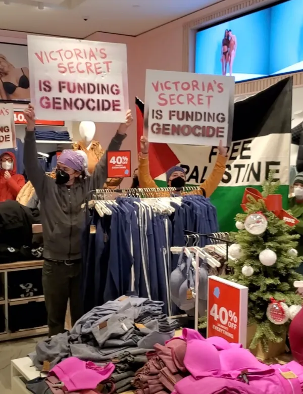 One protestor said, “With the ongoing war crimes committed by the state of Israel we need companies like Victoria’s Secret to stand against genocide and ethnic cleansing and make more ethical business choices. We are calling on the company to cut its ties with the state of Israel.”