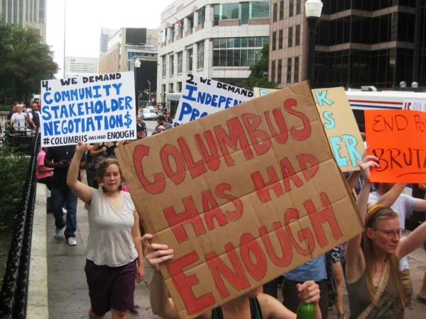 After marching on the sidewalk around the Statehouse, the protesters took over the northbound lanes of High Street for several blocks as they proceeded to police headquarters. Police cruisers surrounded the marchers with lights on and sirens blaring. When police ordered them out of the street, some protesters complied and others didn’t.