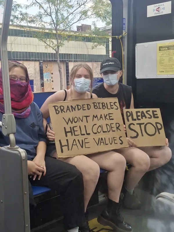 Young women with No Kings signs started entering the bus near OSU. One segment of the women looked like protesters. These women were wearing black sweatshirts, and wearing masks. Then there were normal college freshmen women. I started talking with the women who resembled activists. I told them I wrote for the Free Press and was attending NO Kings. I asked if I could snap a picture of their signs. I then felt like I was neglecting the normal young women. I told them the same thing: I’m a journalist with Columbus Free Press. I requested if I could take a photo of their signs. One of the young women was shy, she said I could flick them but she wasn’t very good at designing signs.