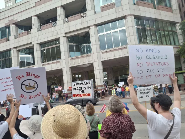 The No Kings Downtown Columbus protest was slated for 4:00 pm during an OSU football game Saturday. No Kings is a nationwide protest which rejects Donald Trump’s authoritarianism. Around the country, seven million people attended No Kings Saturday 10-18-2025.