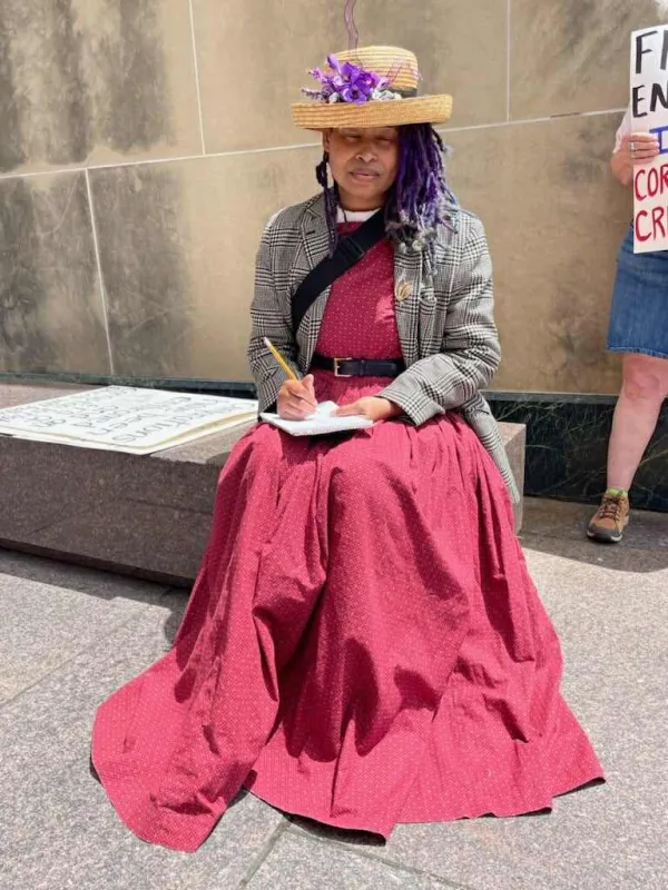 Activists dressed as Ida B. Wells and 1920s reporters pointed out to the crowd that citizens have the right to dissolve corporations.