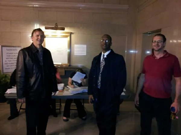 (From left) Joe Sommer, Jon Beard and Doug Zimmerman delivered petitions to Columbus City Hall last week to put City Council's arena-bailout decision on the ballot for voters to decide.