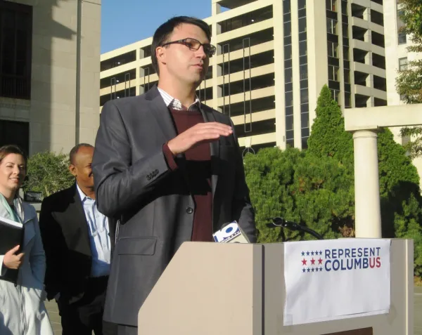 Supporters of Represent Columbus gathered for a press conference outside City Hall on October 19.