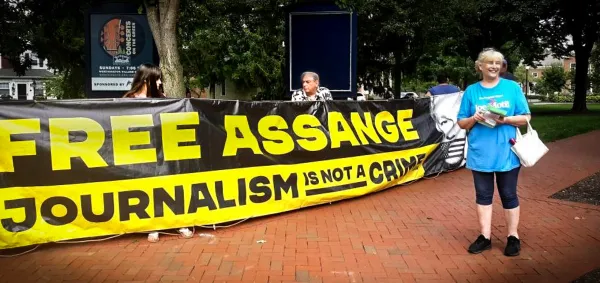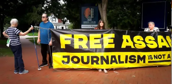 Columbus activists held a banner at 161 and High Street in Worthington last Saturday, August 26 to demand freedom for Julian Assange. Amnesty International says: "The US government’s unrelenting pursuit of Julian Assange for having published disclosed documents that included possible war crimes committed by the US military is nothing short of a full-scale assault on the right to freedom of expression."