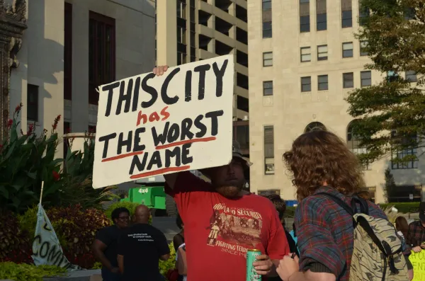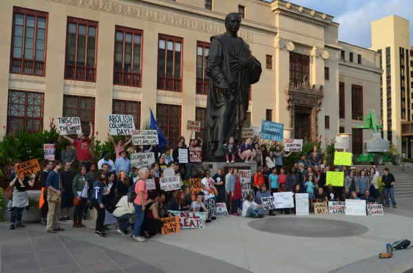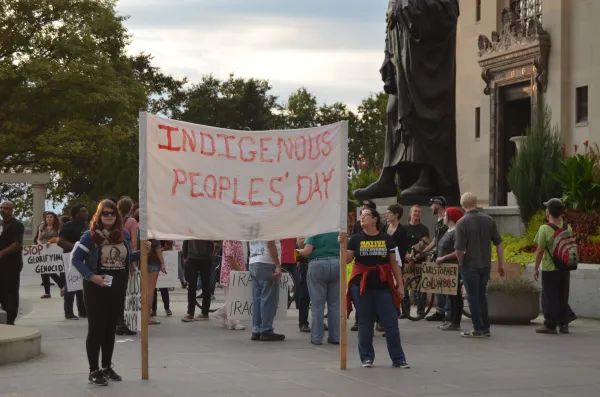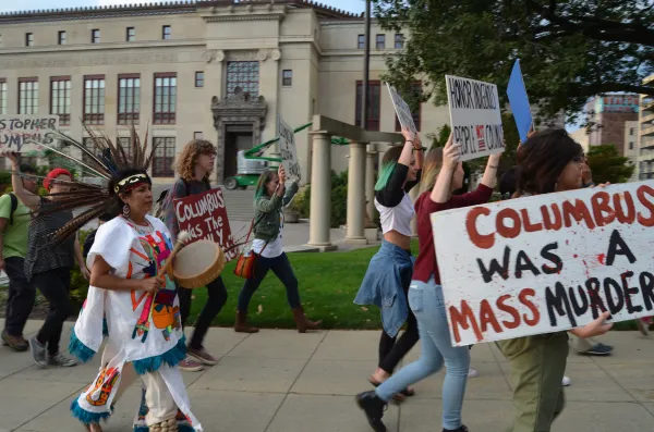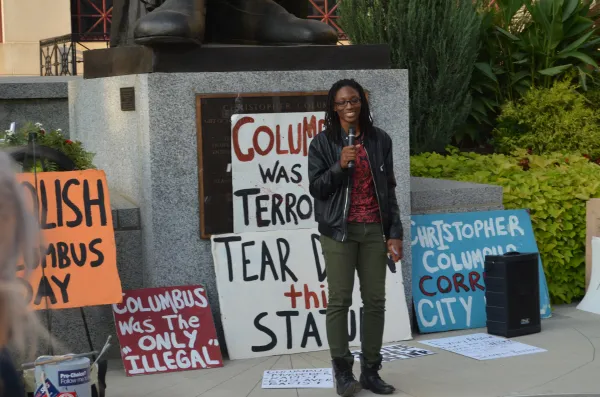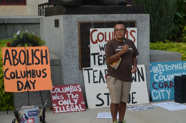 In keeping with a long tradition of protesting the celebration of Columbus Day, dozens of people gathered today, October 12, 2015 by the statue of Christopher Columbus at Columbus City Hall. Signs read "Columbus was a mass murderer," "Tear down this statue," "Stop Celebrating Genocide," "Abolish Columbus Day," and more. Speakers talked about how Columbus' visit to the U.S. brought oppression and death to the indigenous people and fomented racsism and homophobia. The crowd included a diverse group of people including Native American activists. A march to the OSU campus followed the rally. At the lead was a banner proclaiming today as "Indigenous People's Day." Not long ago, after many years of protest by Native Americans and supporters, the Santa Maria ship was removed from the river by City Hall, and City Council once declared the week in October that included Columbus Day "Indigenous People's Week." There was no response from City Council today except for police presence during the rally at City Hall.