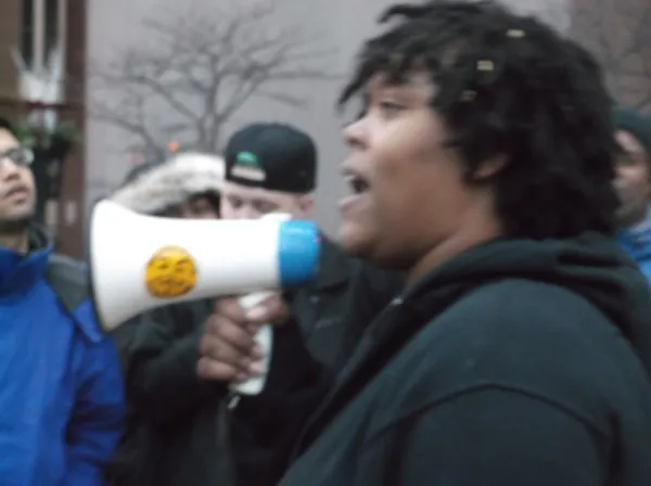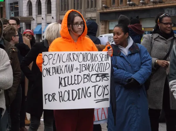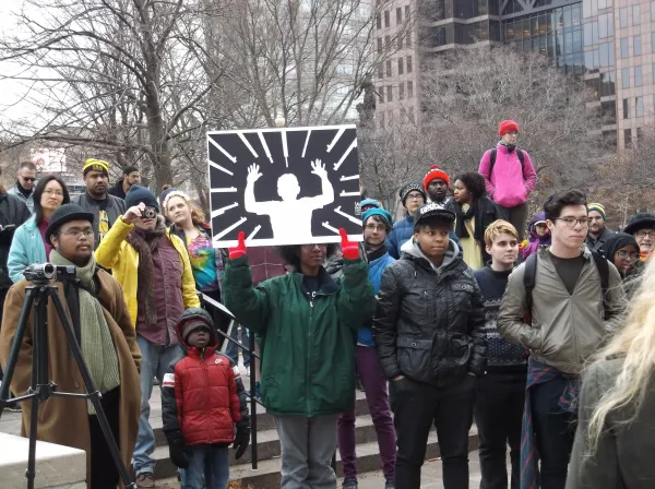 Tuesday afternoon about 100 people gathered at the base of the Peace statute on the east side of the Statehouse to protest the Grand Jury decision to not prosecute Ferguson, Missouri police officer Darren Brown in the shooting death of Michael Brown. The rally was peaceful with over a dozen speakers, mostly young people,urging black and white solidarity.