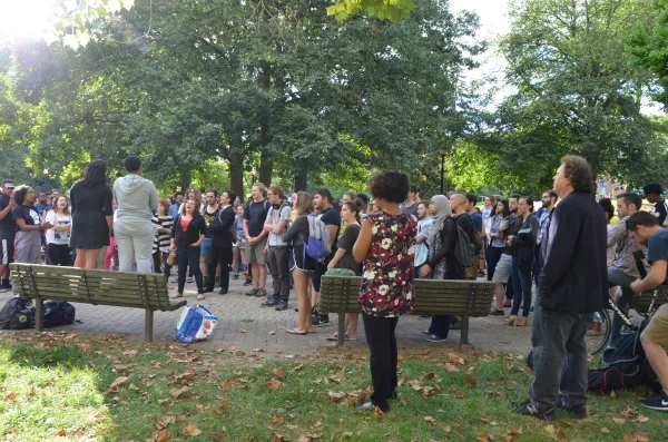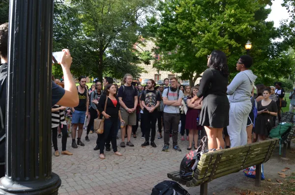 Students and community people gathered on OSU's south Oval at 5pm today to mourn the death of Tyre King, shot to death by Columbus police last night, September 14. Police stated that the 13-year-old had a BB gun. NBC 4 news reported that Bryan Mason, the officer who shot King, had been involved in another fatal shooting in 2012. News reports throughout the last 24 hours have offered differing facts regarding the shooting. Activists were skeptical of the information about the incident given at the Columbus Mayor's press conference and that there would be any repercussions for the officer's actions. Signs at a memorial at the site of the incident clearly indicate the community's distrust in the city of Columbus and Columbus police and or that anyone will be held accountable.