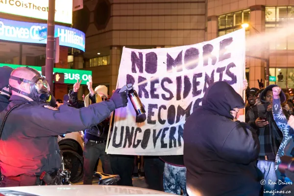 Volunteer medics were also on the scene to support the protesters, administering Maalox to flush their eyes. A police cruiser deliberately bumped into one of the medics, Atticus Garden, who was then arrested.