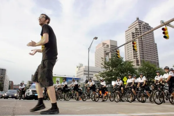 As two officers in the cruiser were speaking with Krakoff, a police sergeant opened the car door and attempted to intimidate him. “When we tell you not to go in the street, and you go in the street, guess what happens?” he said. “You get citations. Remember this face, ’cause you’re going to see a lot of it when you go to jail,” he said, and slammed the cruiser door closed.