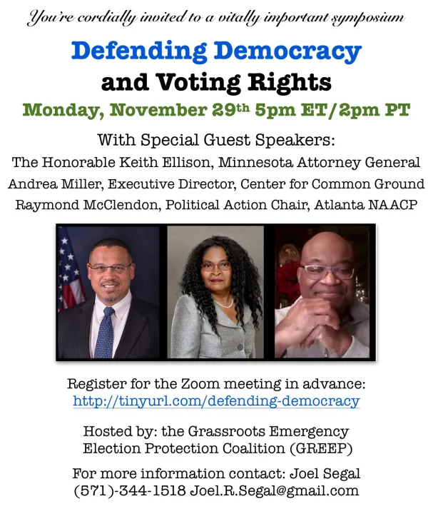 You’re cordially invited to a vitally important symposium Defending Democracy and Voting Rights Monday, November 29th 5pm ET/2pm PT   With Special Guest Speakers:   The Honorable Keith Ellison, Minnesota Attorney General   Andrea Miller, Executive Director, Center for Common Ground   Raymond McClendon, Political Action Chair, Atlanta NAACP    Register for the Zoom meeting in advance:  http://tinyurl.com/defending-democracy   Hosted by: the Grassroots Emergency Election Protection Coalition (GREEP)   For more information contact: Joel Segal (571)-344-1518 Joel.R.Segal@gmail.com