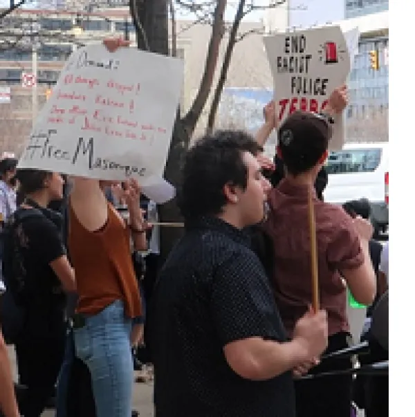 Over 50 people marched from Bicentennial Park to the Franklin County Juvenile Detention Center today to demand the release of Masonique Saunders, 17, who was incarcerated last December. Saunders is being charged with felony murder after Columbus police shot and killed her boyfriend, Julius Tate, in an undercover operation. Saunders was not involved in the murder.