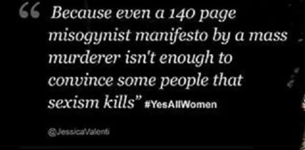 In the wake of the Isla Vista shooting and the discussion that surrounds it, two concepts need to be accepted as truth without equivocation. 1) Inasmuch as we are willing to ascribe a political ideology toward the motivation of seemingly random acts of mass violence, we must extend the same courtesy to Elliot Rodger. Which is to say, that as we accept that global jihad was the motivation for the Boston bombings or the 2009 Fort Hood shooting, or we accept white supremacy as the motivation for the Oak Creek Sikh temple shooting, then we must accept misogyny as an ideology as the motivation for Isla Vista. To argue otherwise in any way is to be disingenuous at best, malicious at worst. 2) Despite its accommodation/co-optation by mainstream capitalist culture, feminism is neither a lifestyle nor a trend.