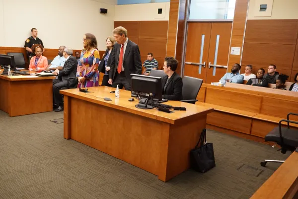 Diona Clark, front left, tells the court she would like Larry Belcher, who shot her twice, to serve prison time, as Belcher sits behind her with his attorney Jim Owen, right.