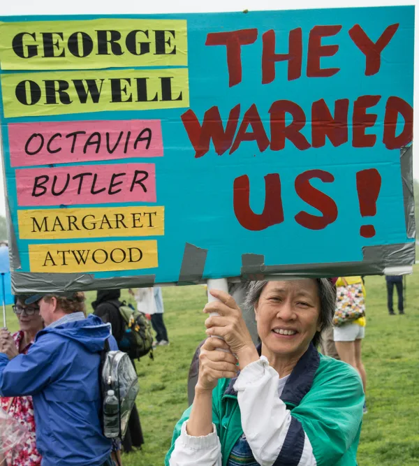 "George Orwell, Octavia Butler, and Margaret Atwood Warned Us (34078351001)" by scattered1 from USA is licensed under CC BY-SA 2.0.
