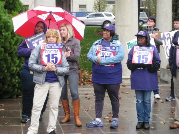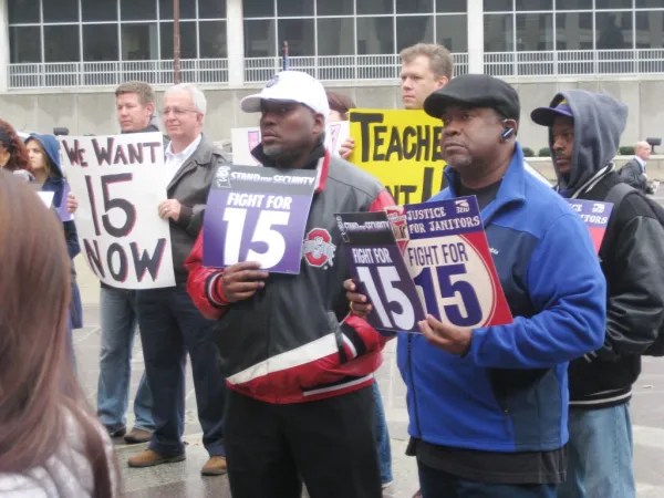 “I’m here to stand up for people who don’t make a decent wage,” said Genelle Rhynehardt, who works as a janitor in the Huntington Center in downtown Columbus. “People have to earn more to better their communities and better themselves.”