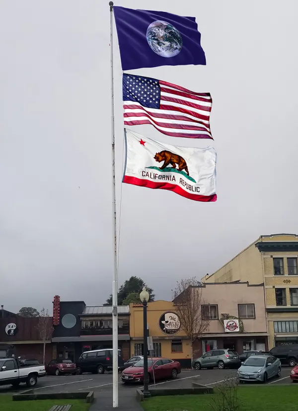 Here in Arcata, California, we are working to introduce and pass a ballot initiative ordinance that will require the City of Arcata to fly the Earth flag at the top of all city owned flagpoles, above the United States and the California flags.