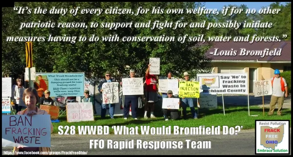 It was also a re-dedication of Louis Bromfield's Big House and we hoped to catch the attention of Governor John Kasich, Ohio Department of Natural Resources Director James Zehringer and Representative Mark Romanchuk as they arrived for the 10am ceremony. A steady stream of cars began a little after 9am and did not let up until much later in the day. We caught a quick glimpse of Romanchuk as he went by and unlike the hundreds of honks, waves and thumbs up from the myriad of other passing motorists, he appeared not to notice our fifty-yard stretch of banners, waving fracktivists and signs protesting fracking. More specifically, the signs protested the threat of Class 2 injection wells and the huge volumes of toxic waste being transported into Ohio daily and shoved into the ground. Louis Bromfield was a native of the area, a writer and most importantly a conservationist who practiced sustainable farming techniques. “What Would Bromfield Do?” was the question of the day. With Bromfield not able to answer the question directly on the issue of Ohio becoming a toxic fracking waste disposal zone, we attempted to address the issue in an open letter to the Governor and other policy makers responsible for Malabar Farm State Park and Richland County in general. We are releasing the letter publicly and copies have been mailed out with fact sheets to validate the points raised in the letter.