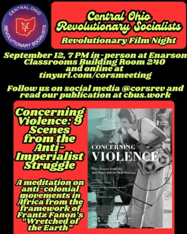 Then, join us at 7 PM for a screening of the film “Concerning Violence” which gives a penetrating look into anti-colonial movements with reference to Frantz Fanon’s classic writings! Meet us in Enarson Classroom Building room 240, or online at tinyurl.com/CORSmeeting