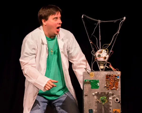 The evening’s highlight is Christmas Time Travel, in which an inventor named Jerry (Jimmy Mak) tries out his new time machine on Christmas Eve and ends up at a certain stable in Bethlehem. There he meets a friendly Joseph (JT Walker III) and a harried Mary (Stacie Boord), both of whom speak in New York Jewish accents.