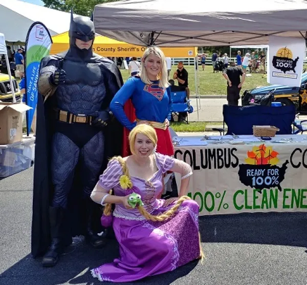 The Ready for 100 table got a visit from superheroes at Grove City Ecofest in August 2019.