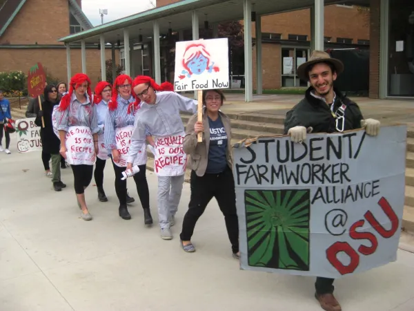 Greedy Wendy hides behind the Nice Wendy mask. For Halloween, members of the Student/Farmworker Alliance at college campuses across the country found creative ways to unmask Greedy Wendy. In Columbus, Ohio, the birthplace of Wendy's, Ohio State University students held a protest outside a Wendy's restaurant. Four protesters dressed as Greedy Wendy tried to enter the store to deliver a letter to the manager and pass out fliers. Their faces wore sinister expressions and their costumes appeared to be smeared with blood. They were turned away at the door.