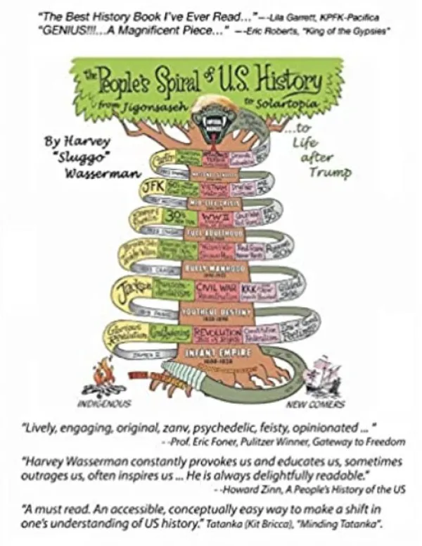 Creative CommonsHarvey WassermanWasserman envisions U.S. history as recurring “spirals” pitting the Puritan against the Indigenous ethos. There are, he argues, six cycles that get regularly shorter: “Infant Empire” from 1688-1828; “Manifest Adolescence” from 1828-1896; “Bully Manhood” from 1896-1932; “Full Adulthood” from 1932-1960; “Mid-Life Crisis” from 1960-1976; and “Imperial Senility” from 1976-1992. “After that, we basically have a flatline, a death rattle, from Clinton to 2022,” he says.Wasserman cites other historians, such as William Appleman Williams (The Contours of American History), Oswald Spengler (Decline of the West), and ninety-two-year-old Quaker Staughton Lynd as influencing his cyclical conception of history. Another prominent historian who impacted Wasserman’s worldview was renowned author Professor Howard Zinn, who “By remaking our view of the founding of this nation and the nature of our class, race and gender relations, Howard framed how the people’s spiral portrays our American story.”He adds, “By upending our understanding of America’s imperial foreign policy, and by reevaluating the cycles that set the rhythms of our story, William A. Williams joined Howard Zinn in making the spiral what it is.” Though The People’s Spiral has some levity, it looks at the evolution of the United States from the vantage point of the “wretched of the Earth,” to quote Frantz Fanon—not from the perspective of the exploiters who have usually been glorified in textbooks. For Wasserman, “American exceptionalism” is the “empire’s superiority complex” justifying “conquering the world.” Amid the “Trumpocalypse” that Wasserman says has been the harbinger of a fermenting civil war, The People’s Spiral’s closing chapters take a look at what could come next.“Democracy is in tremendous danger,” Wasserman says. “The Republican Party, as it stands today, is unprecedented in our history, it’s an outright fascist party. The real reason we’re on the brink of autocracy is the absolute feebleness of the Democratic Party. . . . If we don’t change the technology that gives us our food and energy, our species is doomed.”Find Harvey Wasserman’s book The People’s Spiral of U.S. History here.
