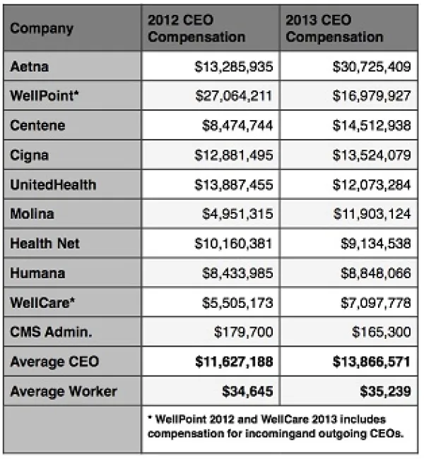 Philadelphia, PA - May 1, 2014 - Chief executive officers at Fortune 500 health insurance companies, who have opposed new regulations under the Affordable Care Act, emerged this month as one of the ACA's greatest beneficiaries. Recently filed financial reports show that average compensation for these top nine health insurance CEOs rose by more than 19 percent in 2013, while several of the nation’s largest insurers more than doubled CEO pay.