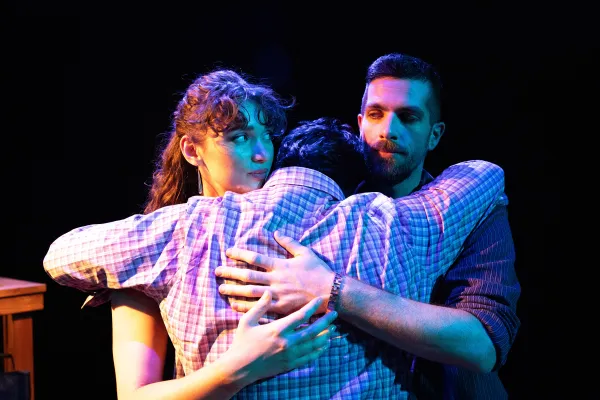 Set during the Trump administration in 2017 only a week after the Charlottesville alt right race riots, in Arbery’s semi-autobiographical Heroes, four childhood friends and classmates, now in their thirties, who’d attended the conservative Transfiguration Catholic college way down yonder Wyoming way hold a reunion to celebrate the promotion of their professor Gina (Roxanne Hart, who was Tony nominated for her role in Passion on Broadway) to the presidency of their religious school. The party takes place at the backwoods cabin (rendered by Roge Machine’s resident scenic designer Stephanie Kerley Schwartz; the rest of the stage is mostly bare) of Justin (Stephen Tyler Howell), a reticent combat veteran who is cut in the mold of the John Wayne-like strong silent type. The action opens with what may be a sly reference to the 1978 Vietnam War movie The Deer Hunter, as the ex-sniper guns down a deer but then, after dragging the corpse onto his porch, paralyzed by conscience, the macho gunslinger is unable to gut it. From time-to-time Justin tries to (Lady Macbeth-like) wipe the bloodstains away during the rest of this two-hour-long, one-acter.