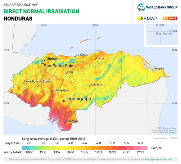 Honduras DNI Solar-resource-map GlobalSolarAtlas World-Bank-Esmap-Solargis.png; © The World Bank, Source: Global Solar Atlas 2.0, Solar resource data: Solargis