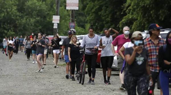 People wait in line to vote in Georgia's primary election at Park Tavern on Tuesday, June 9, 2020, in Atlanta [Brynn Anderson/AP Photo]