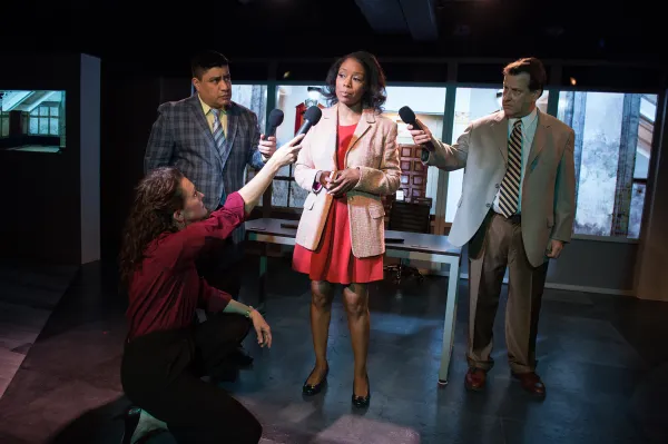 Sachs’ Capra-esque homage opens in a daily’s newsroom with longtime columnist Andy Kramer (Rob Nagle) nagging and confronting newcomer Carl Miller (Matt Kirkwood, who - like much of the seven-person cast - has multiple parts), who is more bean counter than editor. In this day and age of mergers and acquisitions, Miller has been installed by Harold (not Herman!) Cain (stage/screen stalwart James Harper) to be the media mogul’s hit man in order to make the rag profitable. Of course, this means downsizing, reorienting from print to digital, etc., but worst of all, replacing reporting the news per se with more marketable “content” that passes for “journalism.”