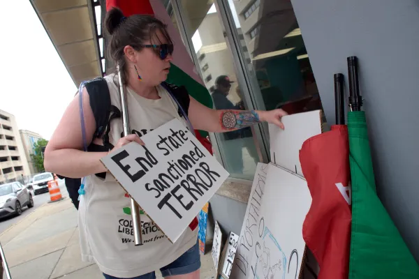 Approximately 50 people representing various organizations, including Veterans for Peace, Students for Justice in Palestine, and The Communist Party of the United States, protested against ICE, the U.S. Immigration and Customs Enforcement, in downtown Columbus, Ohio last Tuesday, June 17, 2025. The protest repeats each Tuesday from 4:30-6PM.