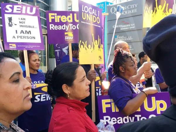 Janitors from Columbus and Cincinnati rally outside Cincinnati's Great American Tower to kick off bargaining for a new union contract.