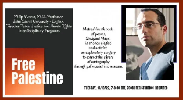 He has been awarded the Adrienne Rich Award, three Arab American Book Awards, the Cleveland Arts Prize, and the Hunt Prize. Metres has been called “one of the essential poets of our time,” whose work is “beautiful, powerful, magnetically original.” His poems have been translated into Arabic, Farsi, French, Polish, Russian, and Tamil. He is professor of English and director of the Peace, Justice, and Human Rights program at John Carroll University, and Core Faculty at Vermont College of Fine Arts. He lives in Cleveland, Ohio. He will be sharing readings from Shrapnel Maps and other works.