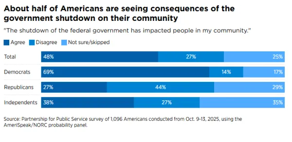A new nationally representative survey conducted by the Partnership for Public Service finds the ongoing federal government shutdown is having a widespread impact on the American people and that the public is concerned the country will face greater problems if additional federal workers are fired. Nearly half of the country (48%) says the shutdown is impacting people in their community.