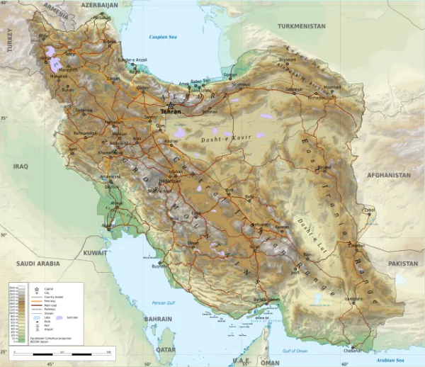 Geographic map of Iran ; Ikonact, CC BY-SA 4.0 <https://creativecommons.org/licenses/by-sa/4.0>, via Wikimedia Commons