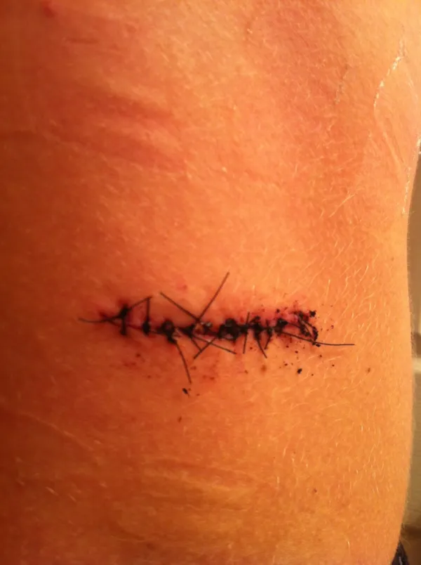 Approximately 12 surgical sutures applied for deep laceration on back; Wompwomp, CC BY-SA 3.0 <https://creativecommons.org/licenses/by-sa/3.0>, via Wikimedia Commons