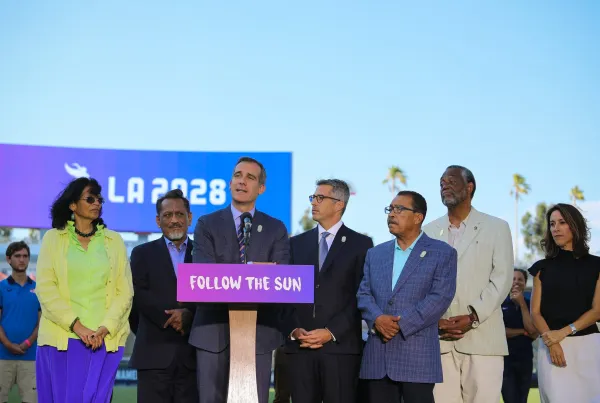 "Mayor Garcetti announcing that Los Angeles will host the 2028 Olympic and Paralympic Summer Games" by Mayor of Los Angeles is licensed under CC BY-NC-ND 2.0.