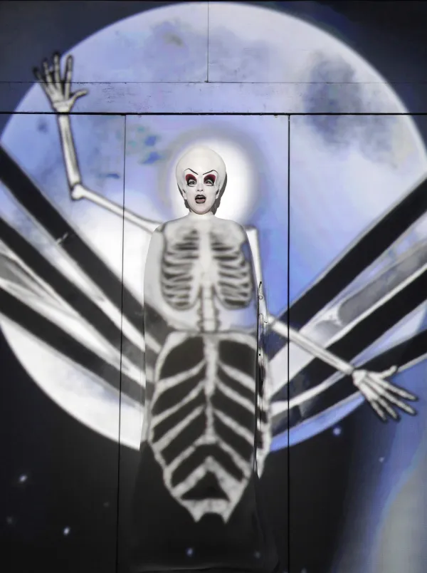 In addition to the innate artistry pertaining to and peculiar to silent movies, the 1927/Komische Oper Berlin production uses lots of 1927’s Paul Barritt-designed animation, which is the format the non-live action imagery is actually projected in, onto the wall Esther Bialas (who is also the costume designer) had constructed, in lieu of LA Opera’s usually lavish sets. This backdrop has elevated portals with sort of revolving doors out of which the various characters such as the “Three Ladies” appear (as this isn’t a Harold Lloyd movie, they’re strapped in harnesses for safety’s sake, as they are perched on high). The visuals are often witty and reminiscent of the type of animated images seen in the Beatles’ Yellow Submarine, Monty Python, Betty Boop Max Fleischer cartoons, and Dumbo - although they never attain the polished CGI perfection offered nowadays by Disney or Pixar, which is, of course, in keeping with the silent screen aesthetics on display here.